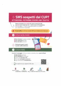 ATTENZIONE, POTREBBE ESSERE UNA TRUFFA! Negli ultimi giorni si stanno moltiplicando tentativi di truffa tramite SMS che utilizzano impropriamente il nome del CUP - Centro Unico di Prenotazione , inducendo i cittadini a richiamare numeri a pagamento.
